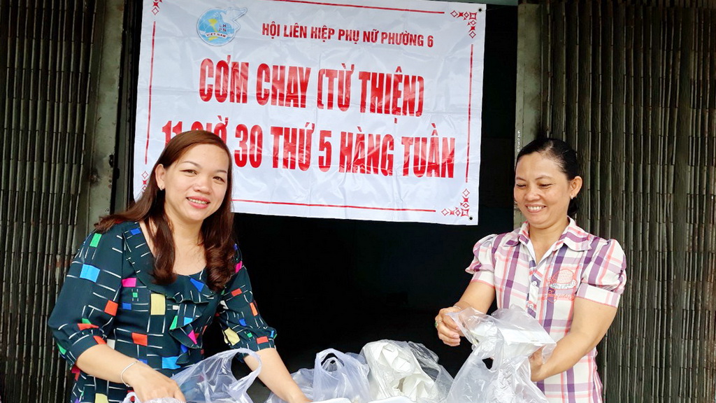 Chi Linh (bên phải) tổ chức phát cơm chay từ thiện vào thứ 5 hàng tuần