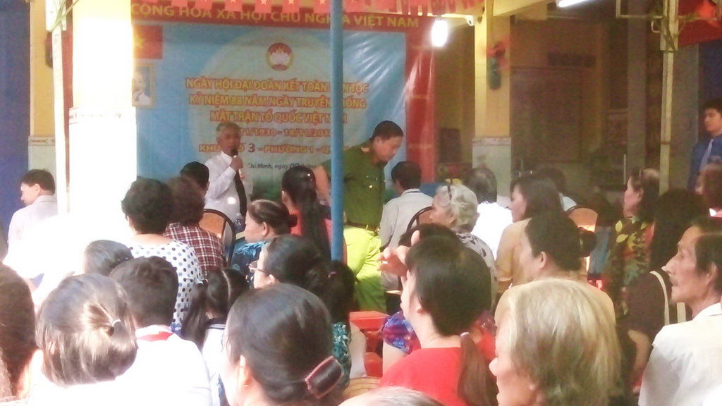 Được sự đồng ý của Ban Thường trực Uỷ ban Mặt trận Tổ quốc Quận 8; và được sự chấp thuận của Đảng ủy - Uỷ ban Mặt trận Tổ quốc Việt Nam Phường 1 Ban công tác Mặt trận khu phố 3 tổ chức Ngày Hội Đại đoàn kết toàn dân tộc ở khu dân cư năm 2018 (Phần lễ ) tại Miếu Bà Khu phố 3; đến tham dự ngày Hội về phía lãnh đạo Quận 8 có ông Phạm Ngọc Muôn – Uỷ viên Ban Thường vụ - Trưởng Ban Dân Vận Quận Uỷ Quận 8; ông Đinh Chí Thành – Phó chủ tịch Uỷ ban Mặt trận Tổ quốc Quận 8; về phía lãnh đạo phường có ông Lê Văn Tám – Bí thư Đảng ủy - Chủ tịch HĐND phường; ông Nguyễn Văn Đại - Phó bí thư Thường trực Đảng ủy; bà Võ Thị Bích Ngọc – Đảng ủy viên – Phó chủ tịch HĐND; ông Nguyễn Thanh Hiệp – Đảng ủy viên – Phó chủ tịch UBND phường; bà Hoàng Thị Hải Vi – Đảng uỷ viên - Chủ tịch Uỷ ban Mặt trận Tổ quốc Việt Nam Phường 1 – cùng các ông bà đại diện cho các ban ngành đoàn thể Phường 1; các ông bà đại diện cấp Uỷ - Ban điều hành – Ban công tác Mặt trận khu phố 3; cùng 100 hộ dân trên địa bàn khu phố đến tham dự ngày Hội./.