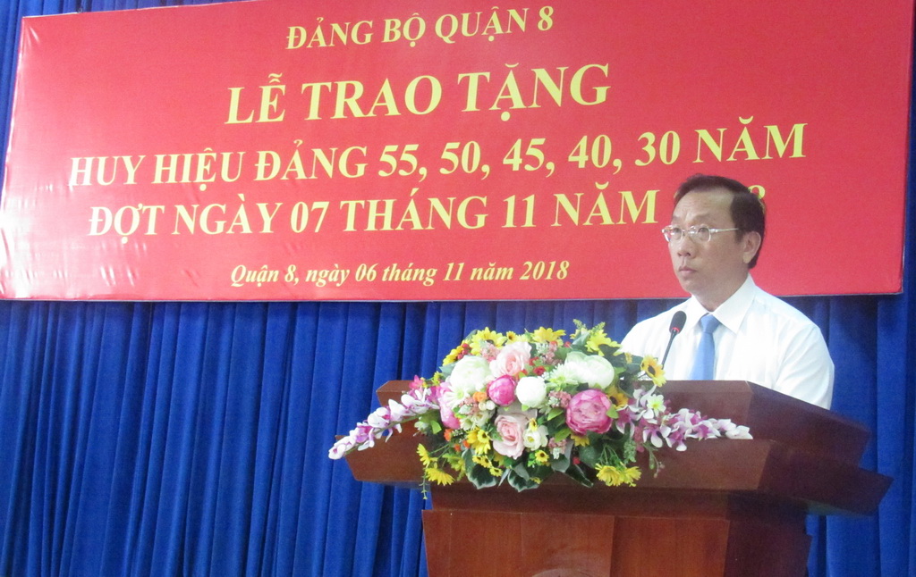 Tại buổi lễ, Bí thư Quận ủy, Chủ tịch Hội đồng Nhân dân quận Ngô Thành Tuấn đã phát biểu chúc mừng các đồng chí đảng viên được trao tặng huy hiệu Đảng; đồng thời, trân trọng và ghi nhận sự tham gia góp sức của các đồng chí đảng viên, nhất là các đồng chí cao tuổi đảng, đảng viên hưu trí trong công tác xây dựng Đảng, xây dựng chính quyền và giáo dục truyền thống, đạo đức lối sống cho thế hệ trẻ ở địa phương trong thời gian qua và mong các đồng chí đảng viên tiếp tục nêu gương sáng trong công tác, giữ vững bản lĩnh chính trị, kiên quyết đấu tranh phản bác những quan điểm sai trái, đóng góp ý kiến, đề xuất những giải pháp trong công tác xây dựng Đảng, chính quyền ở địa phương; thường xuyên quan tâm nhắc nhở đảng viên trẻ thực hiện học tập và làm theo tư tưởng, đạo đức, phong cách Hồ Chí Minh bằng các chương hành động làm theo cụ thể, thiết thực hướng đến chăm lo lợi ích của Nhân dân, để việc học tập có sức lan tỏa trong các tầng lớp Nhân dân, góp phần xây dựng Đảng bộ quận không ngừng lớn mạnh ngang tầm với yêu cầu nhiệm vụ mới. Đồng thời, cùng với chi bộ khu phố, Mặt trận Tổ quốc và các đoàn thể chính trị - xã hội vận động Nhân dân hưởng ứng tích cực các chương trình, cuộc vận động mà Đảng bộ và Chính quyền quận đang tập trung chỉ đạo như: tổ chức triển khai đợt thi đua cao điểm thực hiện các giải pháp, sáng kiến cải cách hành chính trên địa bàn quận từ nay đến cuối tháng 01 năm 2019; cuộc vận động “Người dân thành phố Hồ Chí Minh không xả rác ra đường và kênh rạch, vì Thành phố sạch và giảm ngập nước”, cuộc vận động "Toàn dân đoàn kết xây dựng nông thôn mới, đô thị văn minh"; thực hiện công tác an sinh xã hội, chăm lo cho hộ nghèo, hộ cận nghèo, hộ có hoàn cảnh đặc biệt khó khăn gắn với thực hiện xây dựng Quận 8 văn minh, hiện đại, nghĩa tình như Nghị quyết Ðại hội Đảng bộ quận đã đề ra.