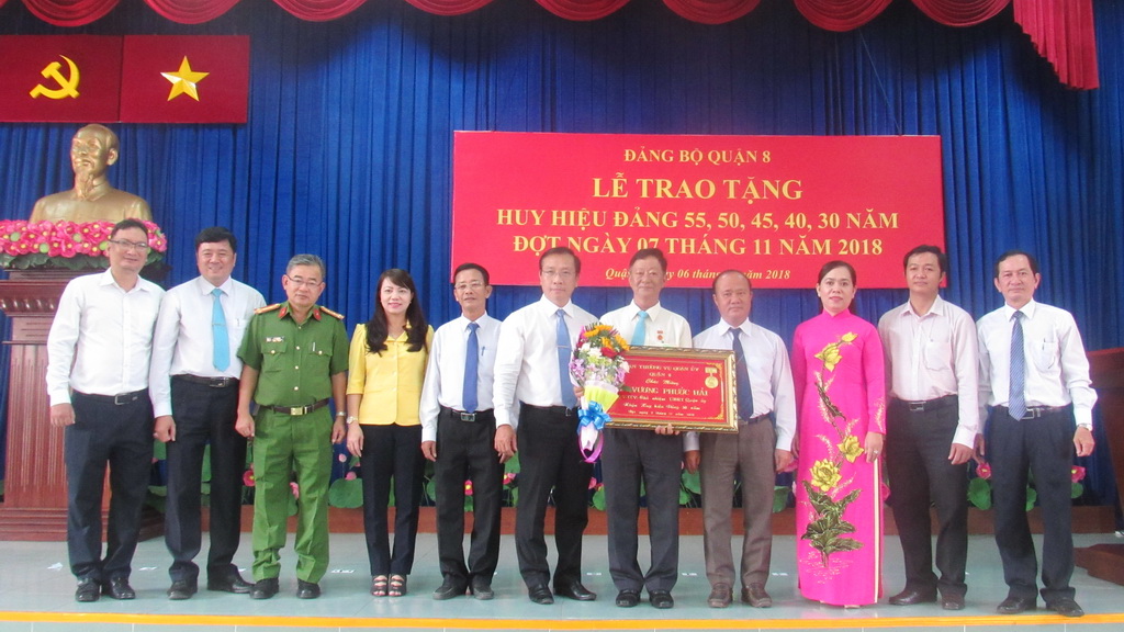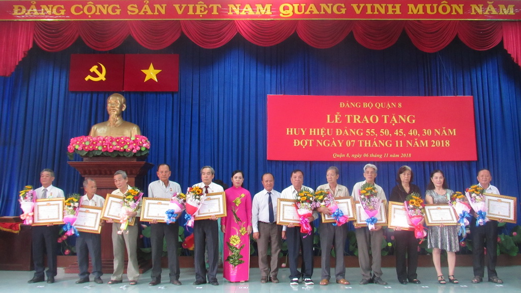 Nhằm thiết thực tổ chức các hoạt động Kỷ niệm 101 năm ngày thắng lợi Cách mạng Tháng Mười Nga (07/11/1917 - 07/11/2018). Sáng ngày 06/11, Quận ủy Quận 8 long trọng tổ chức Lễ trao tặng Huy hiệu Đảng cho 44 đồng chí đảng viên tròn tuổi Đảng 70 năm, 55 năm, 50 năm, 45 năm, 40 năm và 30 năm tuổi Đảng. Đến dự có các đồng chí: Phó Trưởng phòng quận-huyện Ban Tổ chức Thành ủy Trần Mộng Thanh; Phó Trưởng phòng nghiệp vụ 1-Ủy ban Kiểm tra Thành ủy Đỗ Tuấn Anh; Bí thư Quận ủy, Chủ tịch Hội đồng Nhân dân quận Ngô Thành Tuấn; Phó Bí thư Thường trực Quận ủy Đỗ Hữu Trí; Phó Bí thư Quận ủy Nguyễn Thanh Xuân; Phó Bí thư Quận ủy, Chủ tịch Ủy ban nhân dân quận Trần Quang Thảo.