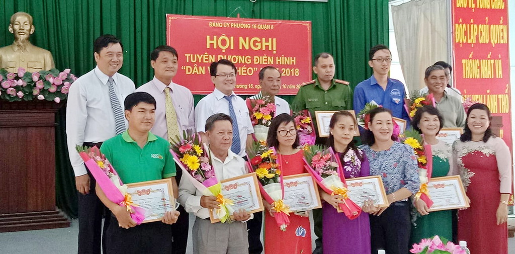 Nhằm kịp thời vinh danh cũng như tạo động lực để các tập thể và cá nhân tiếp tục phát huy hơn nữa vai trò, trách nhiệm của mình trong thực hiện công tác dân vận tại đơn vị và địa phương, góp phần xây dựng Đảng ta ngày càng trong sạch và vững mạnh, sáng 27/10, tại hội trường UBND, Đảng ủy Phường 16 tổ chức Hội nghị tuyên dương điển hình dân vận khéo năm 2018. Đến dự hội nghị có đồng chí Tô Thị Thủy, Phó Trưởng phòng dân vận cơ quan nhà nước Ban Dân vận Thành ủy Thành phố Hồ Chí Minh; đồng chí Phạm Ngọc Muôn, Ủy viên Ban Thường vụ Quận ủy, Trưởng ban Dân vận Quận ủy Quận 8; đồng chí Lê Minh Thông, Quận ủy viên, Bí thư Đảng ủy; đồng chí Nguyễn Thành Nam, Phó Bí thư, Chủ tịch Ủy ban nhân dân; các đồng chí Thường trực Đảng ủy, HĐND, UBND; đại diện Mặt trận và các đoàn thể phường, cấp ủy các chi bộ trực thuộc; chi hội khu phố, tổ dân phố và các tập thể, cá nhân được tuyên dương.