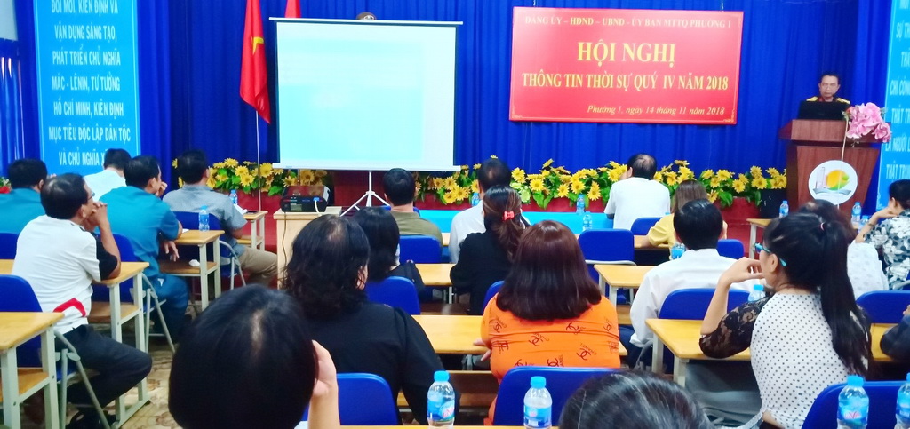 Thực hiện Kế hoạch số 145-KH/ĐU ngày 12 tháng 11 năm 2018 của Đảng ủy phường về việc tổ chức nghe thông tin thời sự dành cho cán bộ, đảng viên, lực lượng an ninh cở sở, lực lượng chính trị nòng cốt; Ban công tác Mặt trận 05 khu phố trên địa bàn phường quý 4 năm 2018; Được sự thống nhất của Đảng ủy phường vào lúc 14 giờ ngày 14 tháng 11 năm 2018; Đảng ủy – HĐND – UBND – Uỷ ban MTTQ Việt Nam Phường 1 tổ chức Hội nghị thông tin thời sự quý 4 năm 2018;