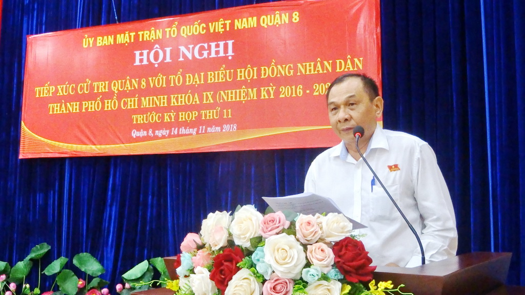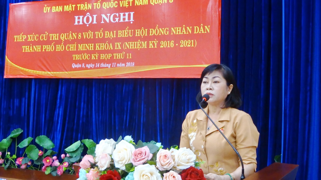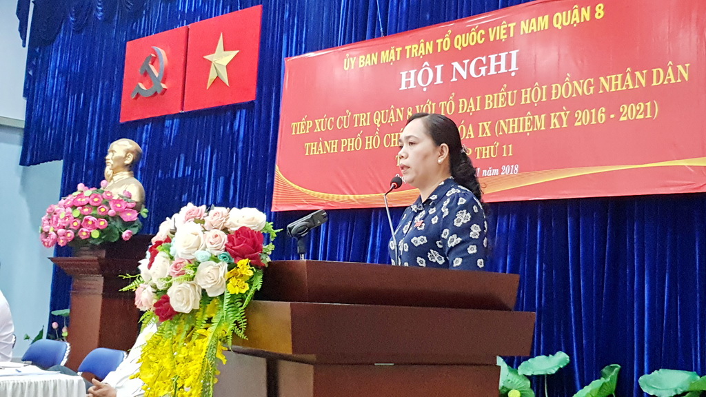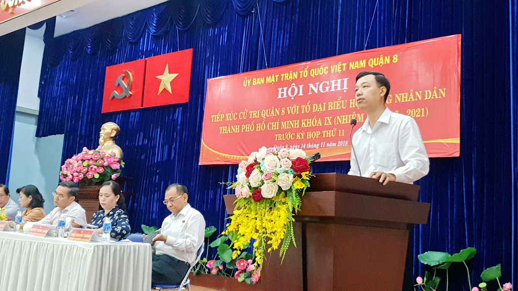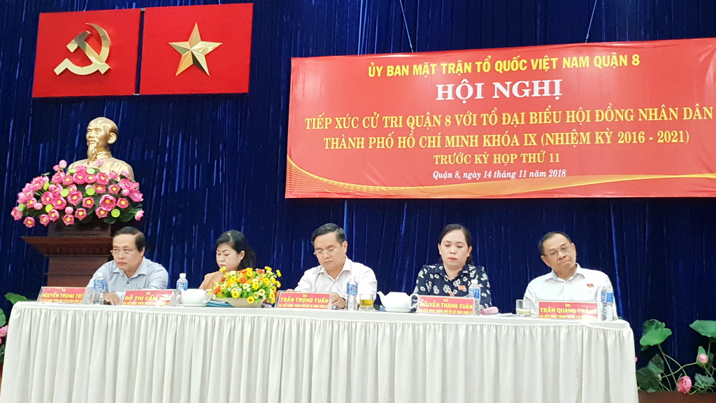 Chiều ngày 14 tháng 11 năm 2018, Tổ Đại biểu Hội đồng Nhân dân Thành phố đơn vị số 8 và số 9, gồm Ông Trần Trọng Tuấn - Ủy viên Ban chấp hành Đảng bộ Thành phố, Giám đốc Sở Xây dựng Thành phố; Ông Nguyễn Quang Thắng - Viện trưởng Viện Kinh tế và quản lý Thành phố; Bà Nguyễn Thanh Xuân - Phó Bí thư Quận ủy Quận 8; Ông Nguyễn Trọng Trí - Phó Giám đốc Đài tiếng nói nhân dân Thành phố Hồ Chí Minh; Bà Đỗ Thị Cẩm Vân - Phó Chủ tịch Hội đồng nhân dân Quận 8, đã có buổi tiếp xúc với cử tri Quận 8 trước kỳ họp lần thứ 11 Hội đồng nhân dân Thành phố khóa IX.