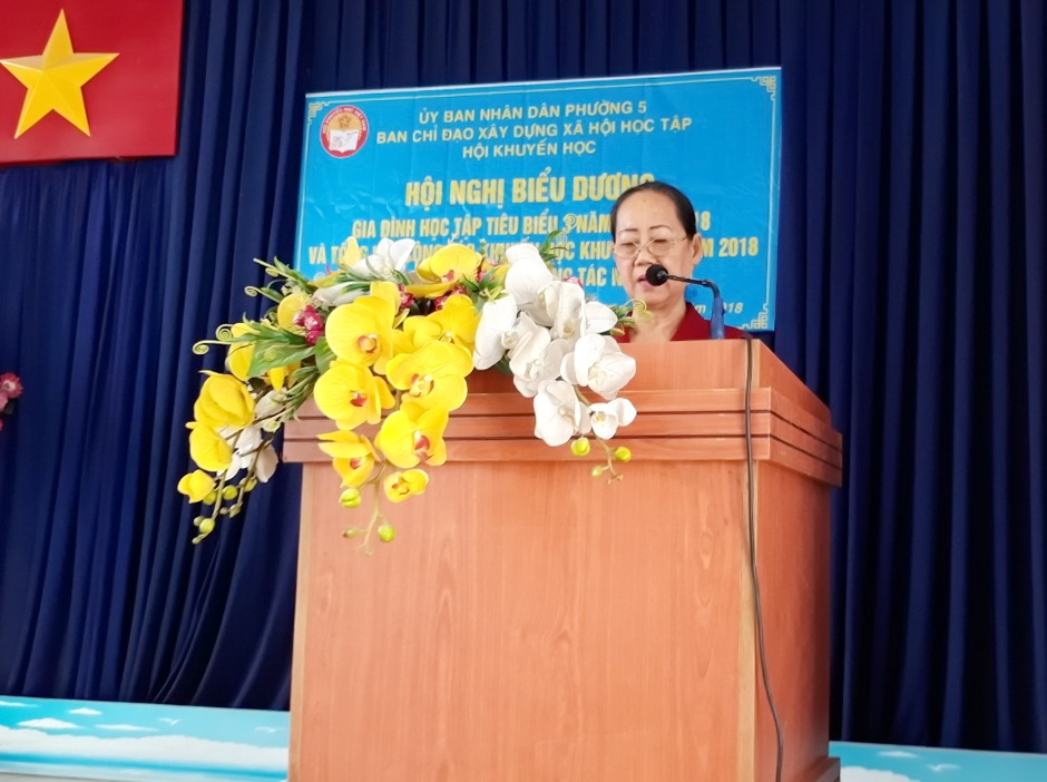 Chào mừng kỷ niệm 22 năm ngày thành lập Hội Khuyến học Việt Nam (02/10/1996 – 02/10/2018) và cùng hòa trong khí thế thi đua yêu nước, hoàn thành các nhiệm vụ chính trị, xã hội năm 2018. Ngày 15 tháng 11 năm 2018, Hội Khuyến học Phường 5 tổ chức “Hội nghị Biểu dương Gia đình học tập tiêu biểu giai đoạn 2016 – 2018 và Tổng kết Công tác Khuyến học, Khuyến tài năm 2018”. Tham dự buổi hội nghị có Ông Huỳnh Khánh Nhiều – Phó Chủ tịch Hội Khuyến học Quận 8; Ông Phạm Thanh Lâm – Phó bí thư thường trực Đảng ủy Phường 5; Bà Đinh Thị Nho – Phó Chủ tịch Hội đồng nhân dân Phường 5; Ông Lâm Thống Nhất – Phó Chủ tịch Ủy ban nhân dân Phường 5; Ông Trần Minh Quân – Chủ tịch Ủy ban Mặt trận Tổ quốc Phường 5, Bà Phạm Thị Kim Phượng – Chủ tịch Hội Khuyến học Phường 5, cùng các đồng chí đại biểu trưởng các ban, ngành, đoàn thể Phường 5, các đồng chí đại diện cấp ủy, ban điều hành 10 khu phố; các đồng chí trong Ban chấp hành phường hội, các đồng chí chi hội trưởng-phó các chi hội và hơn 100 cán bộ, hội viên Hội Khuyến học Phường 5.