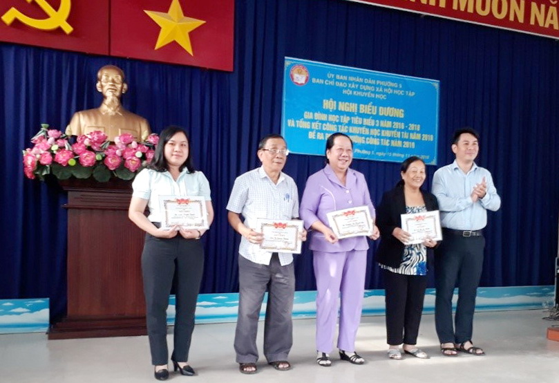 Để động viên, ghi nhận, khen thưởng những tập thể, cá nhân đã có thành tích tốt trong việc thực hiện công tác khuyến học, khuyến tài năm 2018. Hội khuyến học đề nghị Ủy ban nhân dân Phường 5 ban hành quyết định khen thưởng cho các tập thể và cá nhân có thành tích tốt trong việc thực hiện công tác khuyến học, khuyến tài năm 2018 và biểu dương gia đình học tập tiêu biểu giai đoạn 2016-2018.