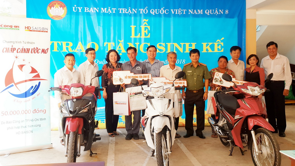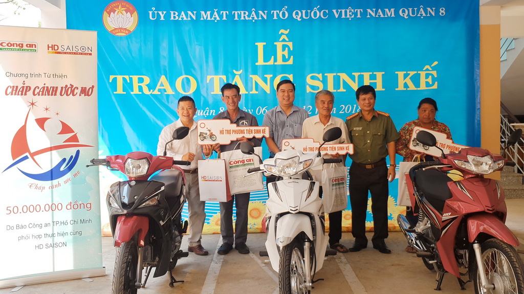 Trong buổi lễ đã trao tặng 3 chiếc xe gắn máy cho người dân có hoàn cảnh khó khăn Phường 2, 9, 10 với tổng kinh phí 50 triệu đồng do Báo Công an Thành phố Hồ Chí Minh vận động Công ty Tài chính Trách nhiệm hữu hạn HD SAISON ủng hộ.