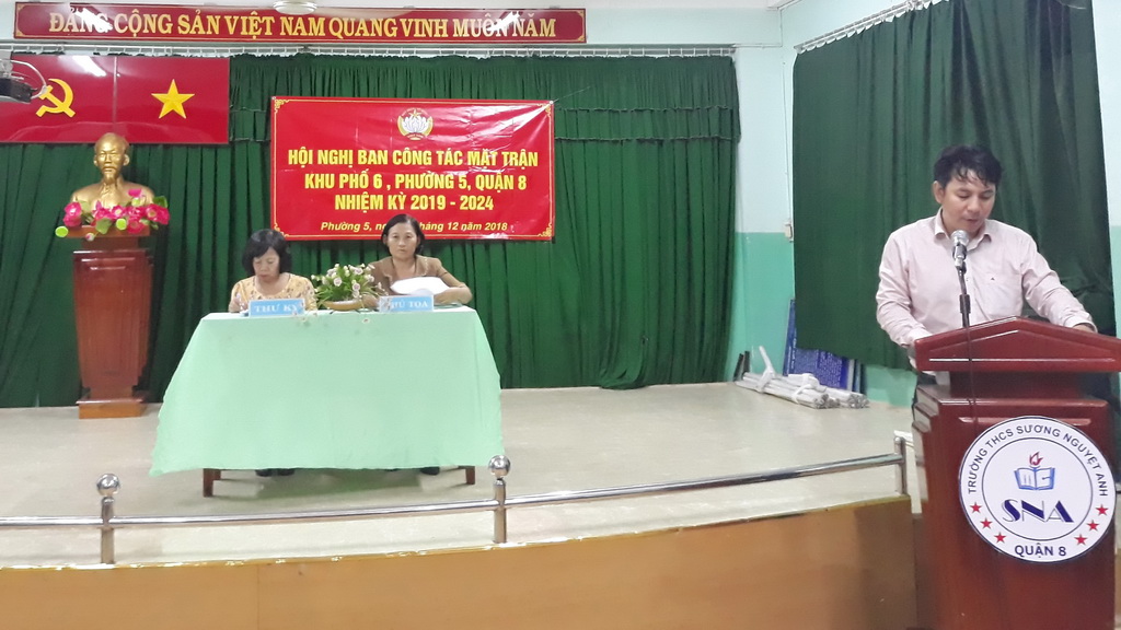 Để chuẩn bị cho Đại hội Mặt trận Tổ quốc (MTTQ) Việt Nam Phường 5 lần thứ XIII (nhiệm kỳ 2019 – 2024), tối ngày 03/12/2018, Ban Công tác Mặt trận Khu phố 6 đã tổ chức hội nghị ban công tác Mặt trận điểm nhằm đánh giá kết quả thực hiện công tác trong nhiệm kỳ XII (2013 - 2018) của Ban Công tác Mặt trận và phương hướng, nhiệm vụ công tác nhiệm kỳ 2019 – 2024. Thảo luận đóng góp ý kiến vào dự thảo lần 2 báo cáo nhiệm kỳ và Chương trình hành động của MTTQ Việt Nam phường nhiệm kỳ XIII (2019 - 2024); đề xuất bổ sung, sửa đổi Điều lệ MTTQ Việt Nam. Phát động và hưởng ứng phong trào thi đua chào mừng Đại hội MTTQ Việt Nam nhằm tạo khí thế phấn khởi của Nhân dân trong cộng đồng dân cư và hiệp thương cử đại biểu dự Đại hội Đại biểu Mặt trận Tổ quốc Việt Nam phường.
