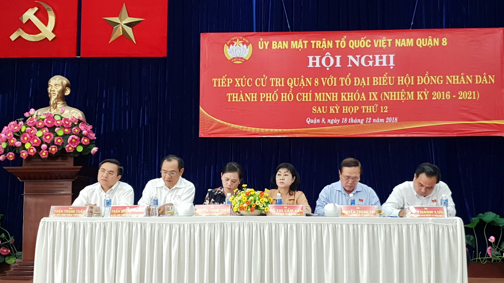 Chiều ngày 18 tháng 12 năm 2018, Tổ Đại biểu Hội đồng nhân dân Thành phố đơn vị số 8 và số 9, gồm Ông Trần Trọng Tuấn - Ủy viên Ban chấp hành Đảng bộ Thành phố, Giám đốc Sở Xây dựng Thành phố; Ông Nguyễn Quang Thắng - Viện trưởng Viện Kinh tế và quản lý Thành phố; Bà Nguyễn Thanh Xuân - Phó Bí thư Quận ủy Quận 8; Ông Vũ Thanh Lưu - Phó chủ tịch Ủy ban Mặt trận Tổ quốc Việt Nam Thành phố; Ông Nguyễn Trọng Trí - Phó Giám đốc Đài tiếng nói nhân dân Thành phố Hồ Chí Minh; Bà Đỗ Thị Cẩm Vân - Phó Chủ tịch Hội đồng nhân dân Quận 8, đã có buổi tiếp xúc với cử tri Quận 8 sau kỳ họp lần thứ 12 Hội đồng nhân dân Thành phố khóa IX.