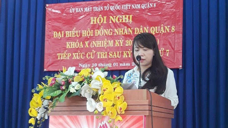 Đồng chí Vũ Thị Huỳnh Mai đại diện Tổ HĐND Quận 8 báo cáo kết quả giải quyết kiến nghị của cử tri.