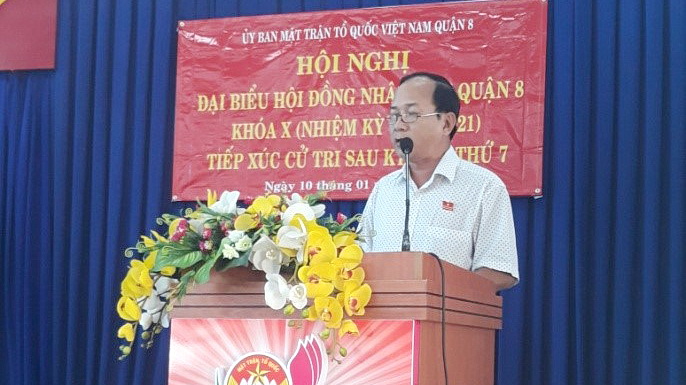 Tại hội nghị, Đại diện Tổ đại biểu Hội đồng nhân dân Quận 8 báo cáo kết quả kỳ họp thứ bảy Hội đồng nhân dân Quận 8 khóa X và báo cáo kết quả giải quyết kiến nghị cử tri.