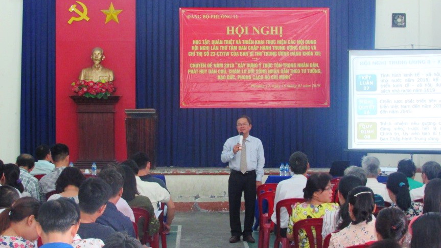 Chiều ngày 16 tháng 01 năm 2019, Đảng ủy phường 12 tổ chức học tập, quán triệt, tuyên truyền và triển khai thực hiện các nội dung Hội nghị lần thứ tám Ban Chấp hành Trung ương Đảng khóa XII; Chỉ thị số 23-CT/TW ngày 09 tháng 02 năm 2018 của Ban Bí thư Trung ương Đảng khóa XII và Chuyên đề năm 2019 “Xây dựng ý thức tôn trọng nhân dân, phát huy dân chủ, chăm lo đời sống nhân dân theo tư tưởng, đạo đức, phong cách Hồ Chí Minh”. Tham dự hội nghị có đồng chí Bí thư Đảng ủy phường và các đồng chí trong BCH Đảng bộ, cấp ủy chi bộ, đảng viên toàn Đảng bộ cùng cán bộ công chức, ban chấp hành các đoàn thể phường. Báo cáo viên hội nghị, đồng chí Hà Trung Thành – Thạc sĩ – Giảng viên Học viện Cán bộ Thành phố Hồ Chí Minh đã tập trung làm rõ quan điểm, mục tiêu, những điểm mới, các giải pháp đột phá và nội dung cơ bản trong Nghị quyết về Chiến lược phát triển bền vững kinh tế biển Việt Nam đến năm 2030, tầm nhìn đến năm 2045; Quy định trách nhiệm nêu gương của cán bộ, đảng viên, trước hết là Ủy viên Bộ Chính trị, ủy viên Ban Bí thư, Ủy viên Ban Chấp hành Trung ương; Kết luận về tình hình kinh tế - xã hội, ngân sách nhà nước năm 2018; kế hoạch phát triển kinh tế - xã hội, dự toán ngân sách nhà nước năm 2019; tiếp tục đổi mới, nâng cao chất lượng, hiệu quả học tập, nghiên cứu, vận dụng và phát triển chủ nghĩa Mác - Lênin, tư tưởng Hồ Chí Minh trong tình hình mới và các nội dung trong chuyên đề năm 2019 về học tập và làm theo Bác. Sau khi học tập, quán triệt Nghị quyết, Chỉ thị và Chuyên đề năm Đảng ủy đề nghị trong sinh hoạt định kỳ tháng tới các cấp ủy chi bộ tổ chức thảo luận, cho đảng viên viết bài thu hoạch và báo cáo Đảng ủy những nhận thức cá nhân của đảng viên về các nghị quyết vừa học, có liên hệ với thực hiện nhiệm vụ chính trị tại địa phương.