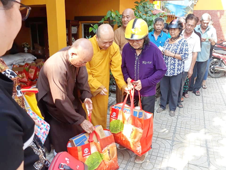 Mặt trận và các đoàn thể phường phối hợp Chùa Thường Quang trao quà tết cho các hộ dân khó khăn