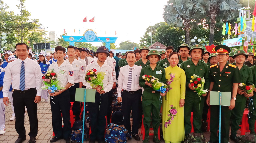 Lãnh đạo Thành phố, quận tặng hoa và hiện kim cho các tân binh (Cảnh sát Biển), đồng chí Nguyễn Văn Hiếu (thứ năm từ trái sang), đồng chí Ngô Thành Tuấn (thứ tư từ trái sang), đồng chí Trần Quang Thảo (thứ tám từ trái sang).