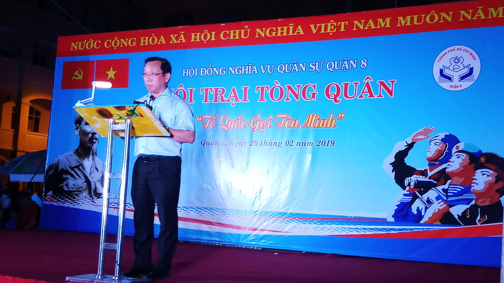 Trước đó, tối 20/02, tại Hội trại tòng quân 2019, Bí thư Quận ủy, Chủ tịch Hội đồng nhân dân Quận 8 Ngô Thành Tuấn cũng đã biểu dương toàn thể công dân đã nghiêm chỉnh chấp hành lệnh gọi nhập ngũ năm 2019, đảm bảo quân số và đúng thời gian quy định; đồng chí đã gửi lời cảm ơn đến các bậc sinh thành đã có công nuôi dưỡng, giáo dục những người con của mình để các em trở thành những chiến sĩ, gánh vác trọng trách vẻ vang bảo vệ tổ quốc, chúc cho các chiến sĩ mạnh khỏe, ra sức học tập, rèn luyện, hoàn thành xuất sắc mọi nhiệm vụ được giao để trở thành chiến sĩ giỏi, chiến sĩ quyết thắng trong Quân đội nhân dân Việt Nam anh hùng.