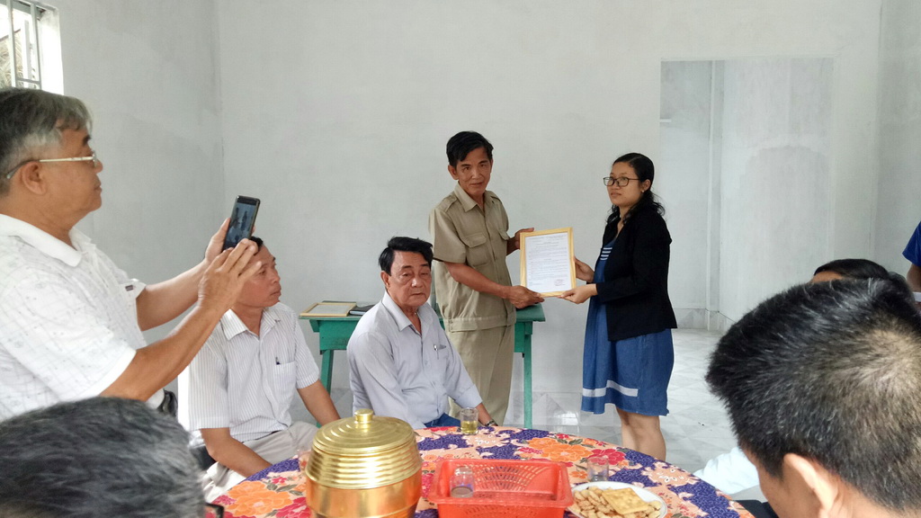 Bà Nguyễn Thị Nhài - PCT UBND phường trao quyết định trao tặng nhà tình thương cho ông Nguyễn Trường Cữu