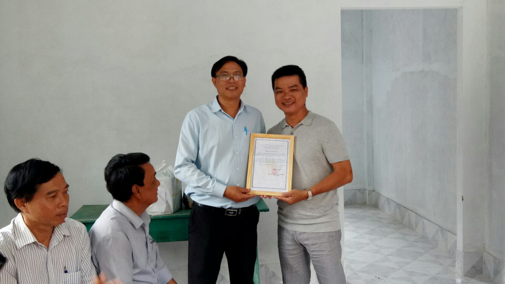Ông Phí Văn Thịnh - Chủ tịch UB.MTTQ phường - Ông Phạm Văn Mỹ đơn vị tài trợ gắn biển nhà tình thương