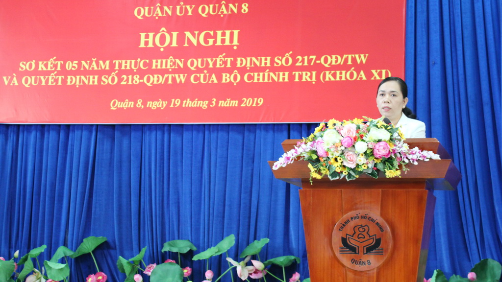 Sáng 19/3, Quận ủy Quận 8 đã tổ chức Hội nghị sơ kết 5 năm thực hiện Quyết định số 217-QĐ/TW, 218-QĐ/TW ngày 12/12/2003 của Bộ Chính trị (Khóa XI) trong việc thực hiện giám sát và phản biện xã hội, tham gia góp ý xây dựng Đảng, xây dựng chính quyền của Mặt trận Tổ quốc Việt Nam, các đoàn thể chính trị - xã hội quận và nhân dân. Đến dự có các đồng chí: Tô Thị Thủy, Phó Trưởng Phòng Dân vận các cơ quan Nhà nước, Ban Dân vận Thành ủy; Nguyễn Thanh Xuân, Phó Bí thư Quận ủy; các đồng chí Thường trực HĐND - UBND quận, lãnh đạo các ban và Văn phòng Quận ủy, Ủy ban MTTQ Việt Nam, các đoàn thể chính trị - xã hội quận; các phòng chuyên môn thuộc UBND quận; đại diện cấp ủy các cơ sở đảng; Thường trực Đảng ủy, HĐND - UBND, Ủy ban MTTQ Việt Nam, các đoàn thể chính trị - xã hội 16 phường.