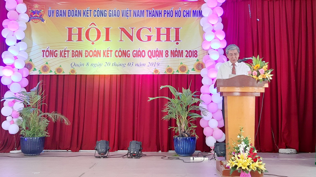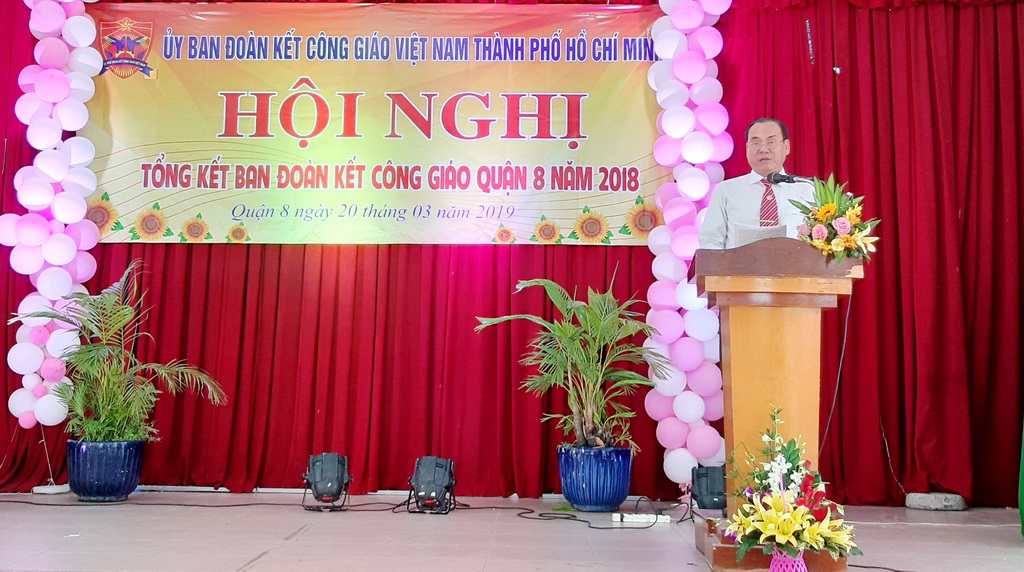 Phát biểu tại hội nghị, ông Mai Hồng Phong – Phó chủ tịch Thường trực Ủy ban Mặt trận Tổ quốc Quận 8 đã biểu dương Ban Đoàn kết Công giáo Quận 8 trong việc phát huy vai trò, trách nhiệm, vận động giới Công giáo tham gia các phong trào do Ủy ban Mặt trận Tổ quốc Quận 8 phát động, tham gia xây dựng khối đại đoàn kết toàn dân tộc, giúp cho người Công giáo hưởng ứng tốt lời mời gọi của Hội đồng Giám mục Việt Nam “Sống phúc âm trong lòng dân tộc”. Ông Mai Hồng Phong đề nghị Ban Đoàn kết Công giáo Quận 8, trong năm 2019 cần tiếp tục tập trung vận động giới Công giáo tiếp tục thực hiện nội dung thư chung của Hội đồng Giám mục Việt Nam và Đức Hồng Y Tổng Giám mục giáo phận Thành phố Hồ Chí Minh về mục vụ, từ thiện – xã hội, y tế, giáo dục; đồng thời thực hiện tốt nội dung chủ đề “Người Công giáo tốt cũng là người công dân tốt”; vận động giáo dân tích cực tham gia cuộc vận động “Người dân thành phố Hồ Chí Minh không xả rác ra đường và kênh rạch, vì Thành phố sạch và giảm ngập nước”, các phong trào thi đua yêu nước tại địa phương; lắng nghe tâm tư, nguyện vọng của cộng đoàn dân Chúa và liên kết chặt chẽ với Ủy ban Mặt trận Tổ quốc trong nắm và phản ánh, trao đổi tình hình.