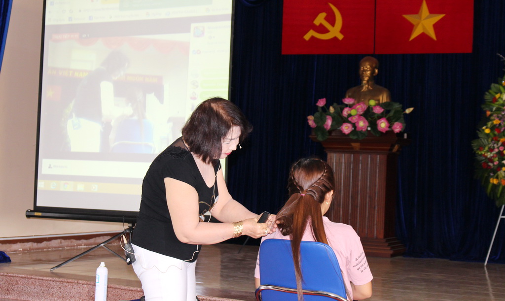 Lớp học với 02 chuyên đề chính: Hướng dẫn cách chải, bím tóc khi đi làm việc và dự tiệc, dạ hội; Tư vấn trang điểm, hướng dẫn trang điểm và chăm sóc da mặt. Có 76 chị em nữ đoàn viên công đoàn và CNVC-LĐ nữ đến từ các CĐCS Ban ngành, đoàn thể của Quận, UBND các phường và các trường Mầm non, Tiểu học, THCS trên địa bàn quận tham gia. Ê kíp Chuyên gia trang điểm và làm tóc của Thạc sĩ - Lê Thị Kim Trinh - GĐ Cty Đào tạo nghề Thành Nhân – tư vấn, hướng dẫn, thực hành.
