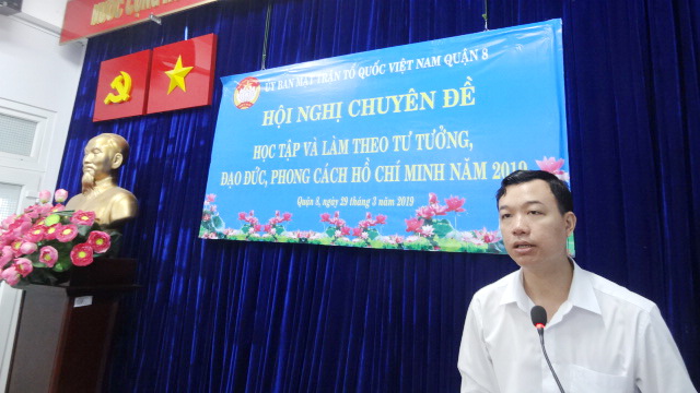Nhằm nâng cao chất lượng, hiệu quả việc học tập và làm theo tư tưởng, đạo đức, phong cách Hồ Chí Minh năm 2019 trong hệ thống cán bộ Mặt trận Tổ quốc Quận, Phường, sáng ngày 29/3/2019, Ban Thường trực Ủy ban MTTQ Quận 8 đã tổ chức Hội nghị chuyên đề “Xây dựng ý thức tôn trọng Nhân dân, phát huy dân chủ, chăm lo đời sống Nhân dân”.