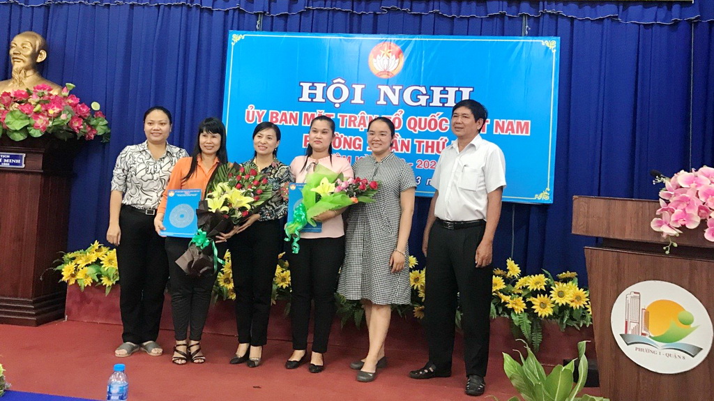 Bà Phan Kiều Thanh Hương – Quận ủy viên - Chủ tịch Uỷ ban Mặt trận Tổ quốc Quận 8 cùng các đồng chí lãnh đạp Phường 1 trao Quyết định và tặng hoa chúc mừng cho Ban Thường trực Uỷ ban MTTQ Việt Nam Phường 1