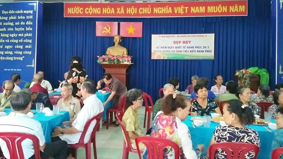 Chiều 20/3, Ủy ban Nhân dân, Hội Người cao tuổi Phường 14 tổ chức họp mặt ngày Quốc tế hạnh phúc. Đến dự có bà Huỳnh Hương Thảo, chuyên viên Phòng Văn hóa và Thông tin Quận 8, bà Nguyễn Thị Hồng Hạnh, Phó Bí thư thường trực Đảng ủy, Bà Phạm Thị Bích Ly, Đảng ủy viên, phó Chủ tịch Ủy ban Nhân dân Phường 14 cùng hơn 50 người là cán bộ, hội viên, người cao tuổi.