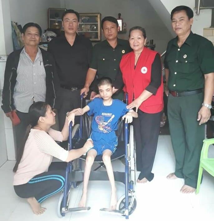 Đại diện khu phố, Hội Chữ thập đỏ phường và Chi hội Tin Lành Phú Định trao tặng xe lăn cho trẻ em khuyết tật