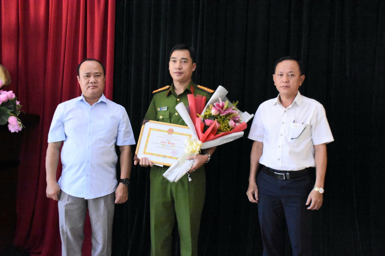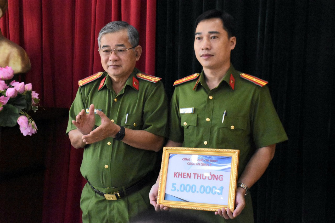 Phó Bí thư Thường trực Quận ủy Quận 8 Đỗ Hữu Trí và Phó Chủ tịch Thường trực UBND quận Nguyễn Thanh Sang vừa trao khen thưởng đột xuất cho tập thể Đội Cảnh sát điều tra tội phạm về Kinh tế và Chức vụ (Đội CSĐTTP về KT và CV) - Công an Quận 8 có thành tích xuất sắc trong khám phá hiềm nghi vụ việc "Sản xuất hàng giả là thuốc chữa bệnh" trên địa bàn quận.
