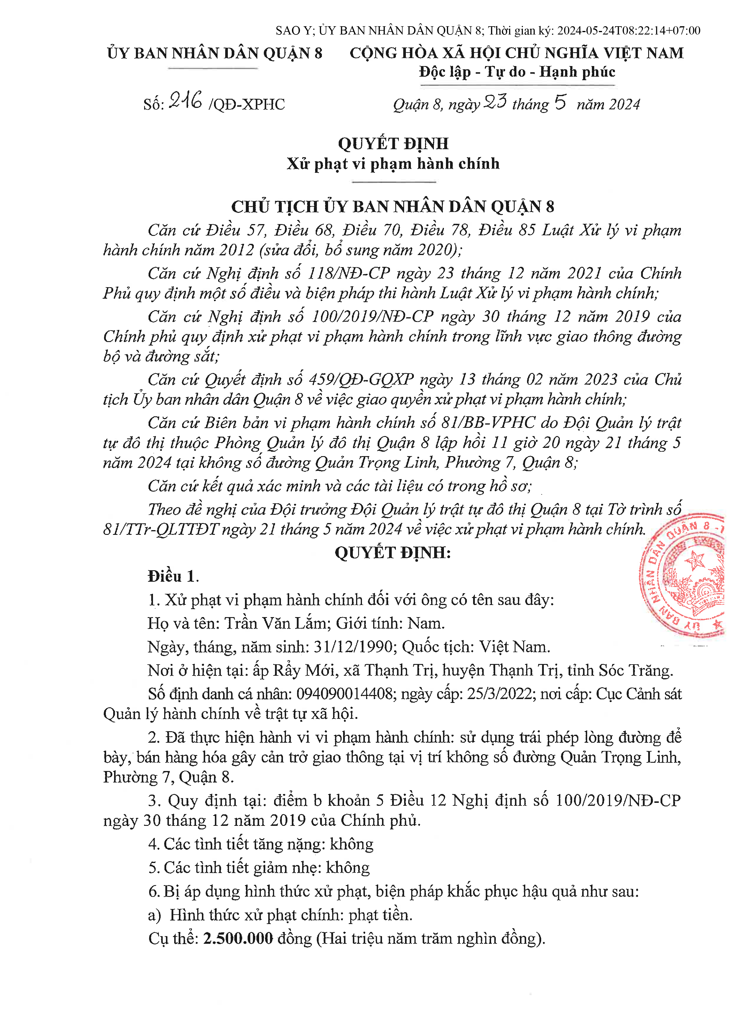xử phạt vi phạm hành chính ông Trần Văn Lắm - QĐ số 216/QĐ-XPHC