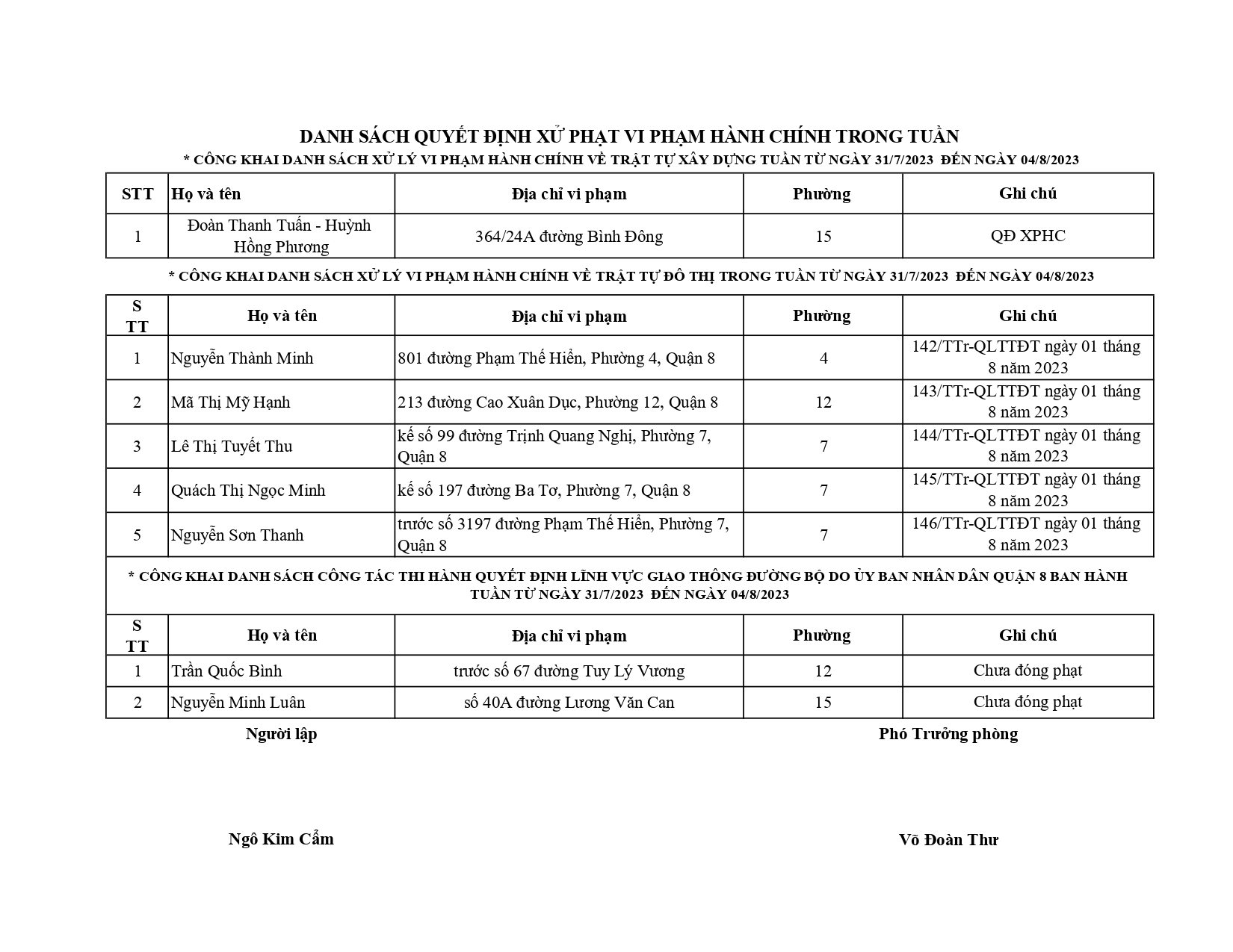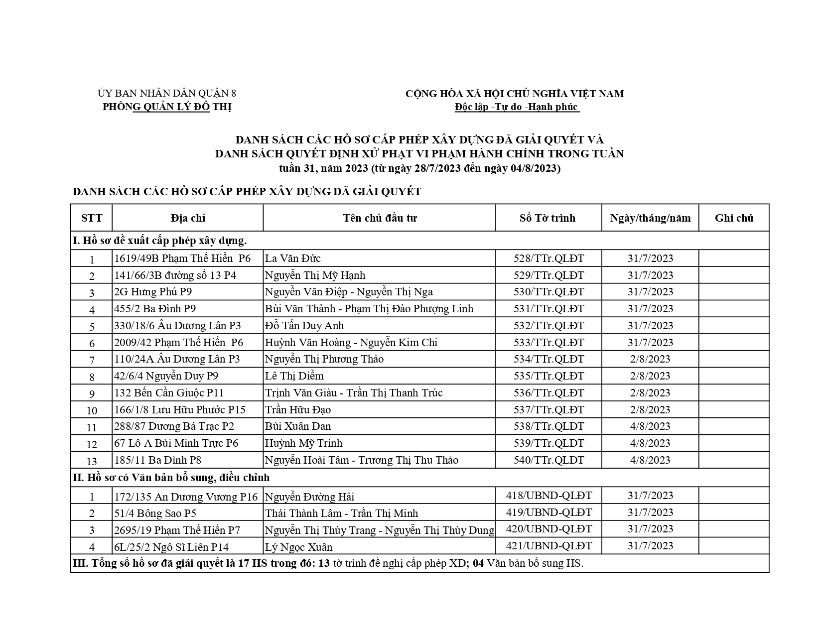 CÔNG KHAI DANH SÁCH HỒ SƠ CẤP PHÉP XÂY DỰNG ĐÃ ĐƯỢC GIẢI QUYẾT TRONG TUẦN TỪ 28/7/2023 ĐẾN 04/8/2023