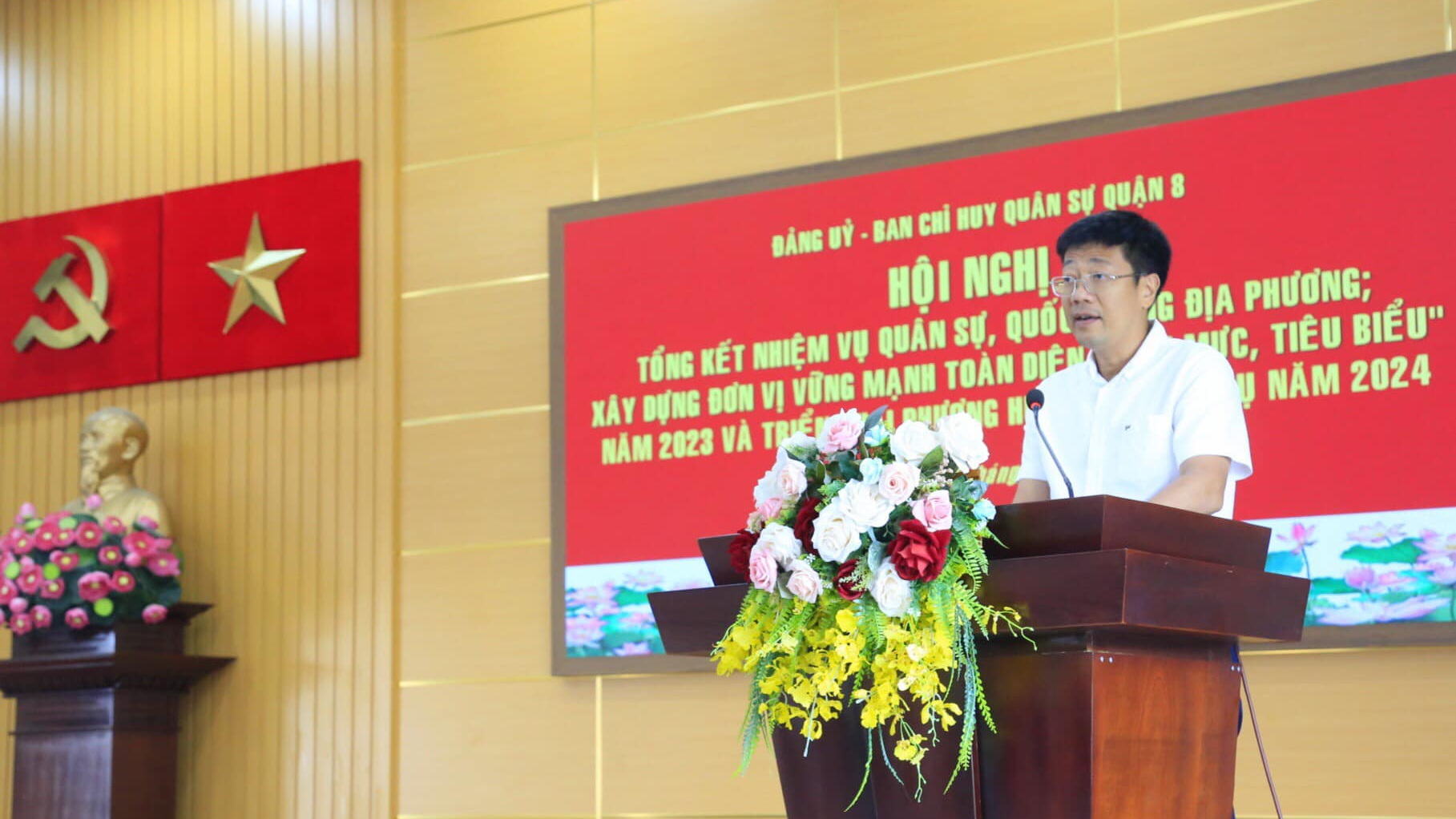 Tại hội nghị, Phó Bí thư Quận ủy, Chủ tịch UBND quận Trần Thanh Tùng ghi nhận và đánh giá cao kết quả đạt được của Quân sự quận trong thời gian qua. Đồng thời lưu ý Quân sự quận cần tiếp tục tham mưu Quận ủy - UBND quận lãnh đạo, chỉ đạo, thực hiện nhiệm vụ quân sự, quốc phòng địa phương năm 2024; chỉ tiêu giao quân năm 2024 tăng so với năm 2023 (từ 195 tăng lên 205) do đó cần phối hợp chặt chẽ với Mặt trận Tổ quốc, các đoàn thể chính trị - xã hội quận, phường tập trung thực hiện, đảm bảo chất lượng và an toàn tuyệt đối, hoàn thành chỉ tiêu giao quân ở cả 02 cấp; tiếp tục duy trì xây dựng đơn vị nền nếp chính quy, an toàn, đơn vị vững mạnh toàn diện “mẫu mực, tiêu biểu”; xây dựng và phát huy lực lượng chính trị nòng cốt trong lực lượng quân nhân dự bị và dân quân, tự vệ; tiếp tục và duy trì giữ thành tích đạt được trong huấn luyện, tham gia hội thi, hội thao quốc phòng; tích cực bám sát các ngành, các cơ quan chức năng để triển khai xây dựng Thao trường huấn luyện quân sự tại Phường 15; tổ chức thực hiện có hiệu quả nhiệm vụ quân sự, quốc phòng, góp phần giữ vững ổn định chính trị, phát triển kinh tế, xã hội.