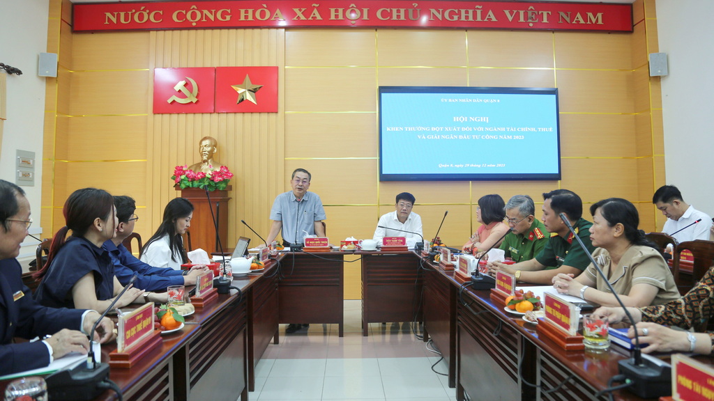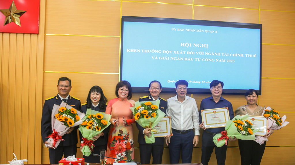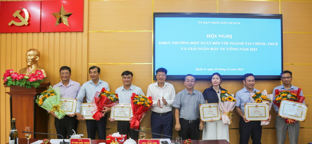 Sáng 29/12/2023, nhằm kịp thời động viên, biểu dương các cơ quan đơn vị đã có nhiều nỗ lực trong thực hiện công tác thu ngân sách và giải ngân vốn đầu tư công, Ủy ban nhân dân Quận 8 tổ chức hội nghị khen thưởng đột xuất đối với ngành Tài chính, Thuế và giải ngân vốn đầu tư công năm 2023;