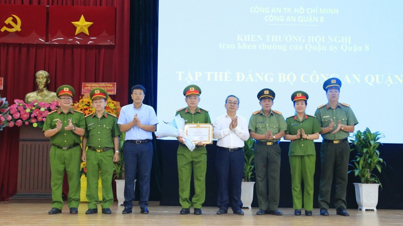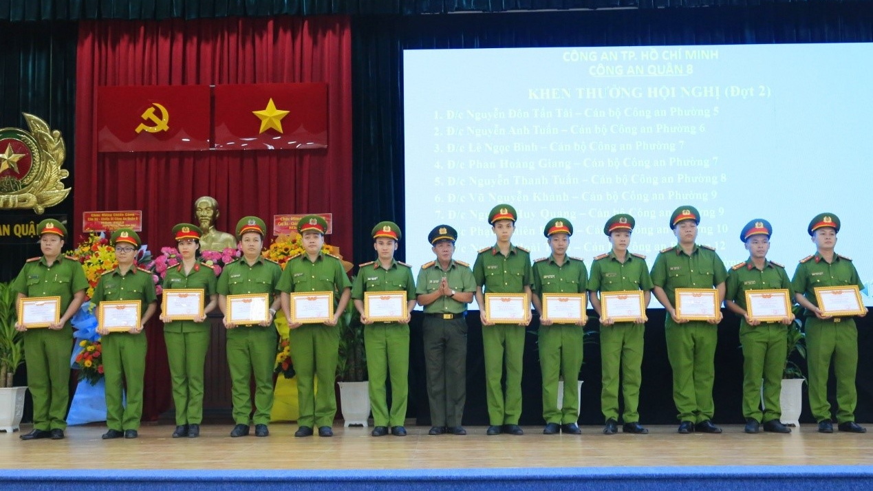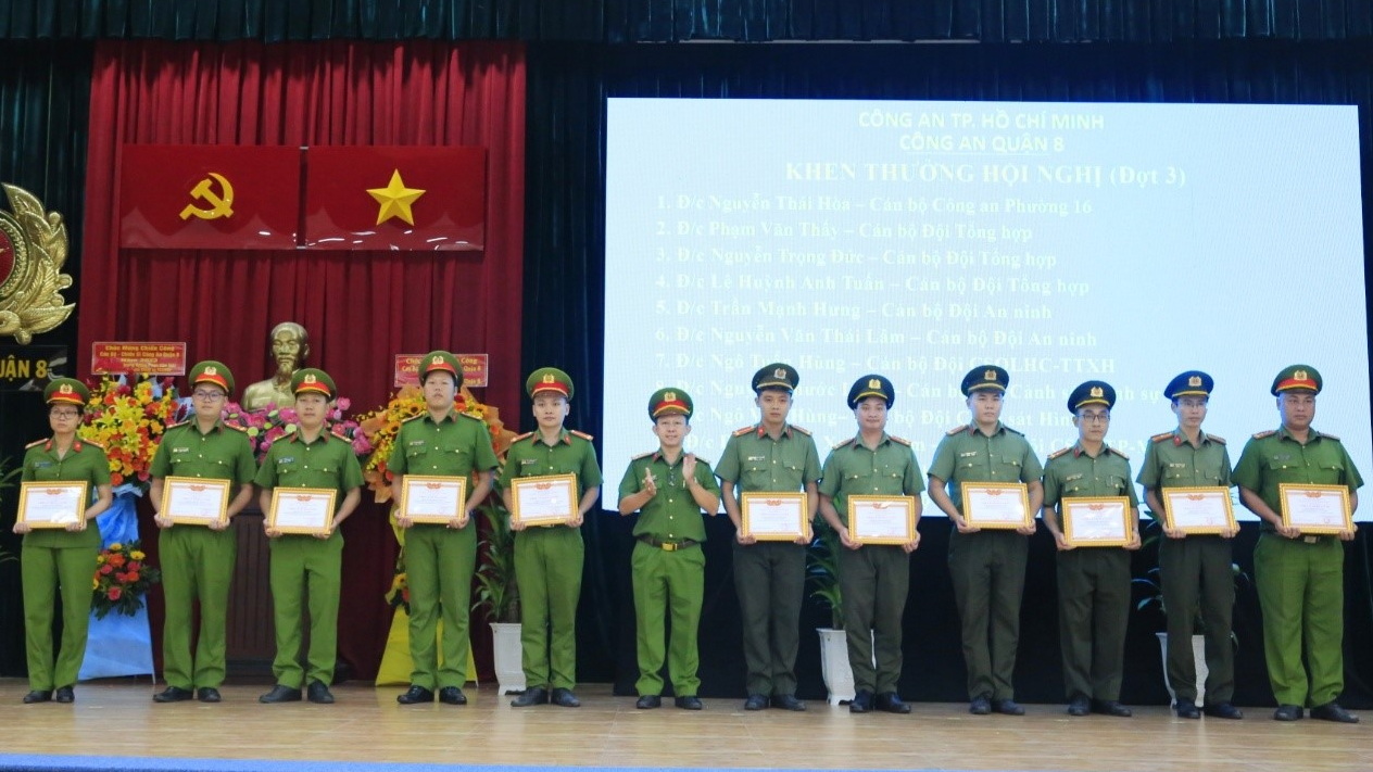 Dịp này, hội nghị đã tổ chức trao tặng danh hiệu đơn vị xuất sắc và danh hiệu chiến sĩ thi đua cơ sở cho các tập thể, cá nhân có thành tích xuất sắc trong phong trào thi đua "Vì an ninh tổ quốc" năm 2023; Quận ủy Quận 8 trao khen thưởng cho tập thể Đảng bộ Công an quận có thành tích xuất sắc trong công tác đảm bảo an ninh chính trị, trật tự an toàn xã hội trên địa bàn quận năm 2023 và khen thưởng 10 tập thể, cá nhân có thành tích nổi bật trong công tác đấu tranh, khám phá các chuyên án lớn trong năm 2023.