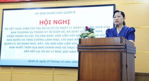 Sáng ngày 27/12/2024, Ủy ban nhân dân Quận 8 tổ chức hội nghị sơ kết thực hiện Chỉ thị số 24-CT/TU ngày 11/11/2019 của Ban Thường vụ Thành ủy về kiểm kê, rà soát quỹ đất, nhà, công trình và các tài sản khác gắn liền với đất thuộc sở hữu Nhà nước và tăng cường lãnh đạo, chỉ đạo nâng cao hiệu quả quản lý, sử dụng nhà, đất, tài sản gắn liền với đất thuộc sở hữu Nhà nước trên địa bàn Thành phố và thực hiện phương án sắp xếp lại và xử lý nhà đất năm 2024.