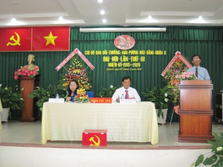 Đoàn Chủ tịch Đại hội Chi bộ Ban Bồi thường giải phóng mặt bằng Quận 8 lần thứ III nhiệm kỳ 2015 – 2020 đã trình bày báo cáo kết quả thực hiện Nghị quyết nhiệm kỳ 2010 – 2015 và phương hướng nhiệm vụ nhiệm kỳ 2015 – 2020 của Chi bộ Ban Bồi thường giải phóng mặt bằng Quận 8; trình bày báo cáo kiểm điểm Ban chấp hành Cấp ủy chi bộ nhiệm kỳ 2010 – 2015.