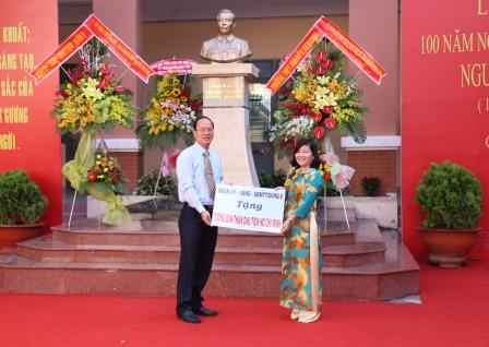 Ảnh: Đồng chí Nguyễn Hồ Hải, Bí thư Quận ủy thay mặt Ban Thường vụ Quận ủy tặng trường trung học phổ thông Nguyễn Văn Linh tượng bán thân Chủ tịch Hồ Chí Minh