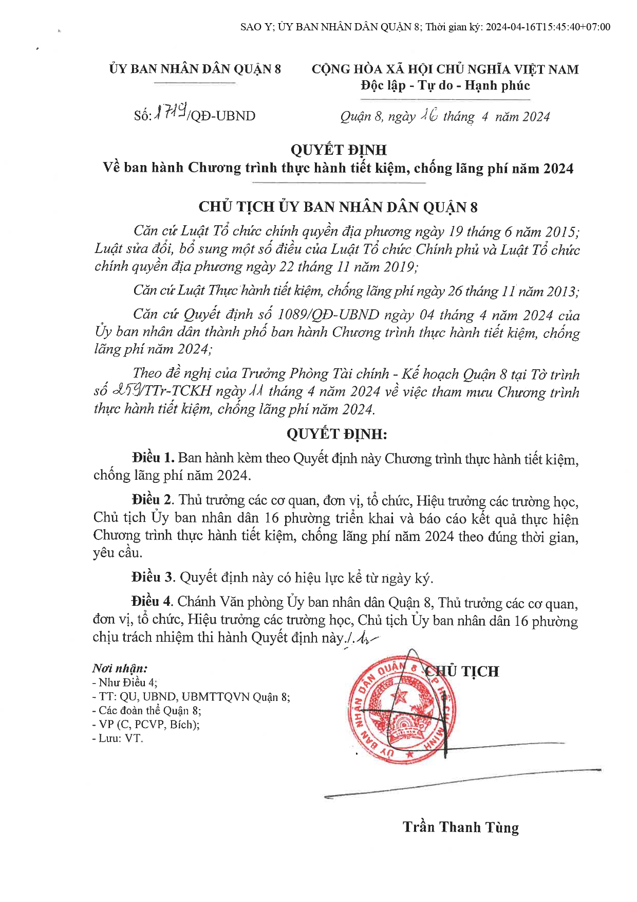 Quyết định về ban hành Chương trình thực hành tiết kiệm, chống lãng phí năm 2024