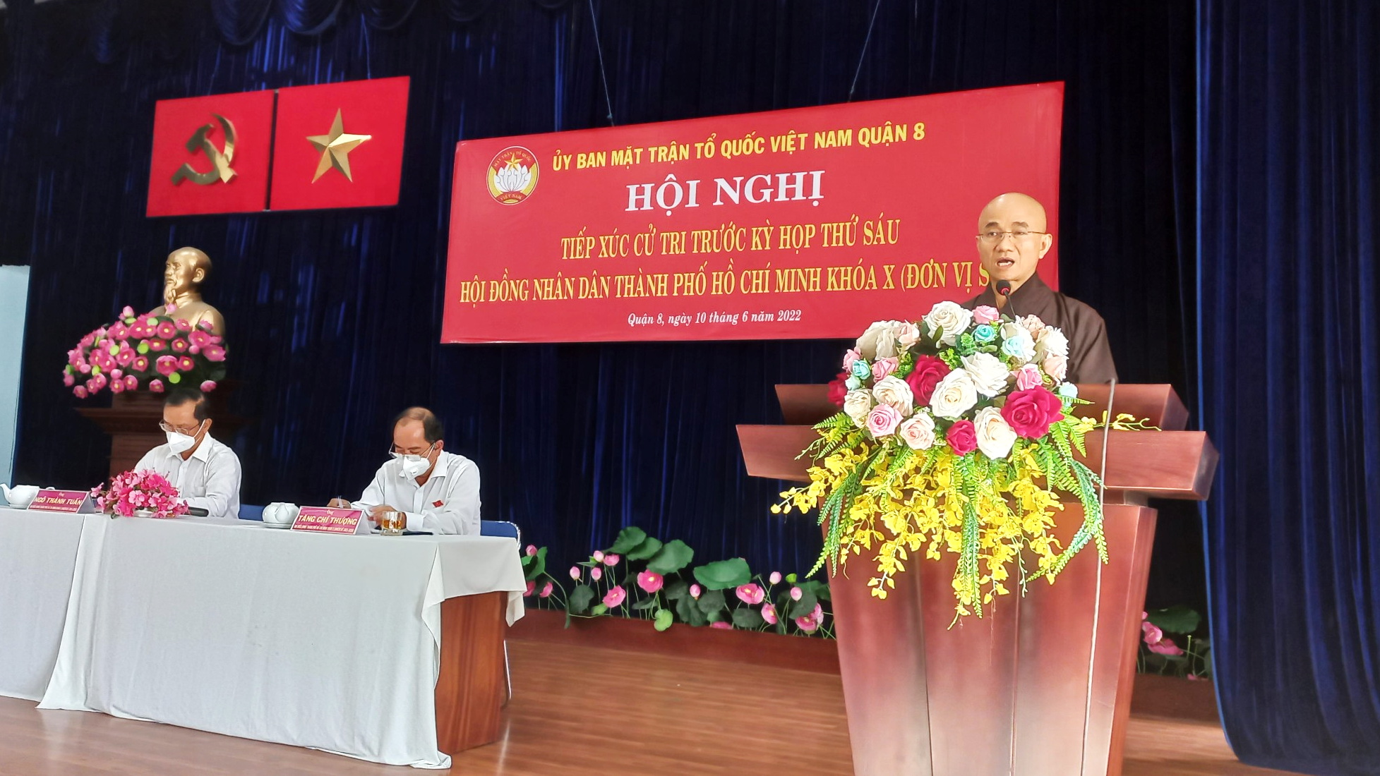 Sáng ngày 10 tháng 6 năm 2022, Tổ Đại biểu Hội đồng nhân dân Thành phố (đơn vị số 10) gồm: Ông Tăng Chí Thượng - Thành ủy viên, Giám đốc Sở Y tế TPHCM; Ông Ngô Thành Tuấn - Bí thư Đảng ủy Khối doanh nghiệp TPHCM; Ông Huỳnh Văn Phương - pháp danh Thượng tọa Thích Thiện Quý - Ủy viên Hội đồng trị sự Trung ương Giáo hội Phật giáo Việt Nam, Phó trưởng ban Ban Trị sự Giáo hội Phật giáo Việt Nam TPHCM đã có buổi tiếp xúc với cử tri Quận 8 trước kỳ họp lần thứ 5.